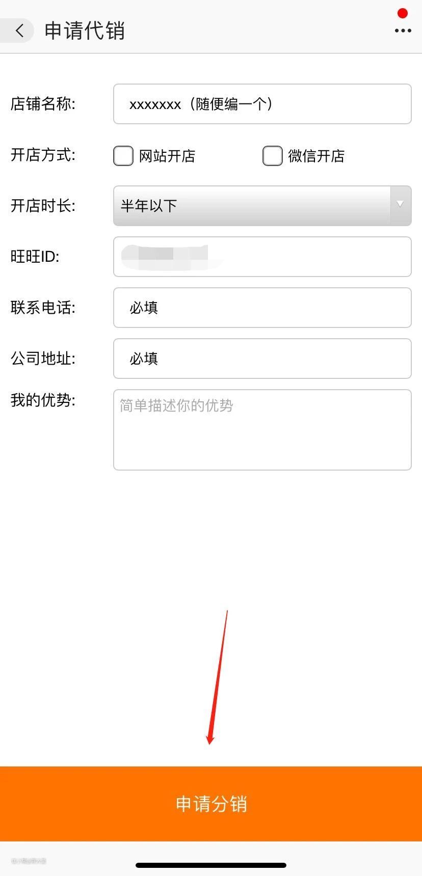 店铺那行随便填就行,再把地址填上就能申请分销。