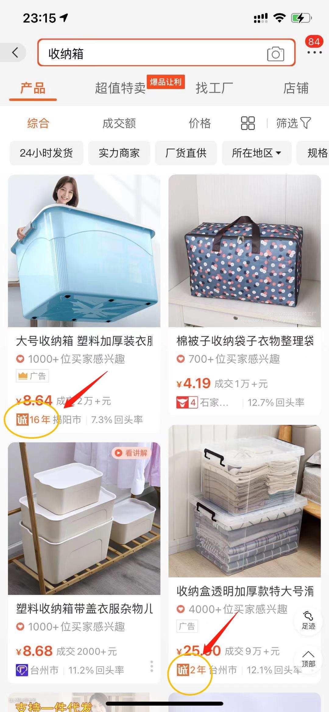 如下图标识,后面的数字代表进驻时间(年),数字越大说明进驻时间越久,也就是我们理解的1688“老店”。