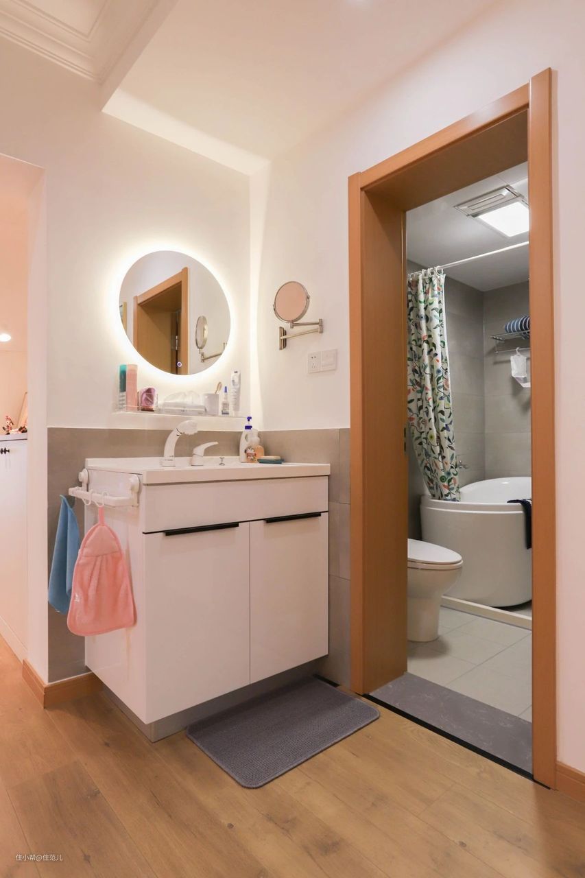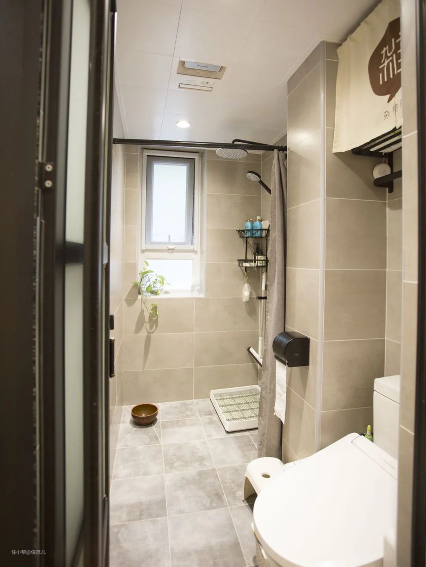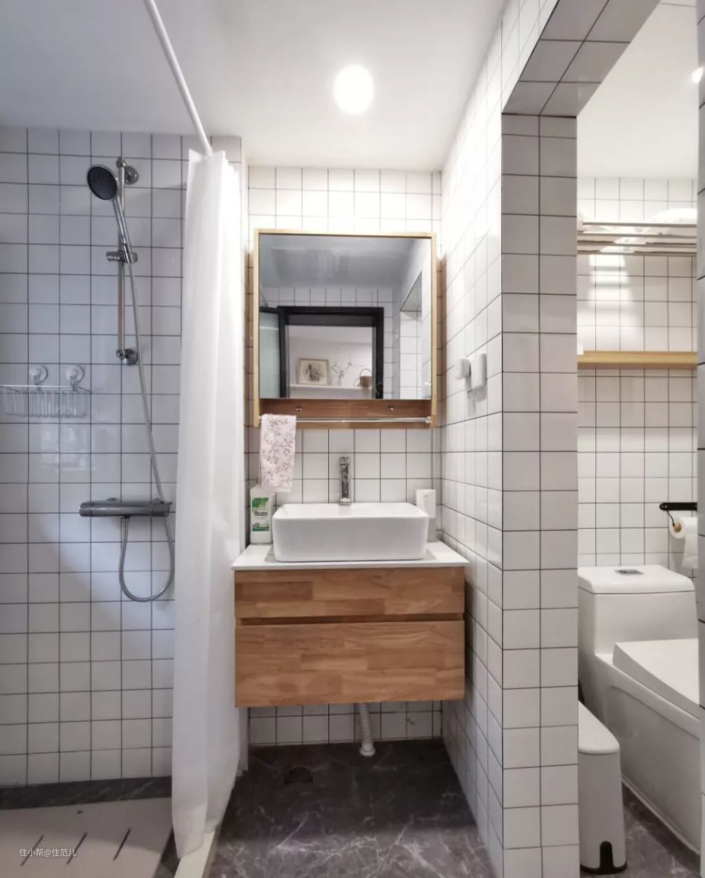 马桶和淋浴的区域归置在卫生间内,把洗手台放在外面。这是最有效的既不动墙,又能扩大卫生间使用面积,同时实现干湿分离的方法。