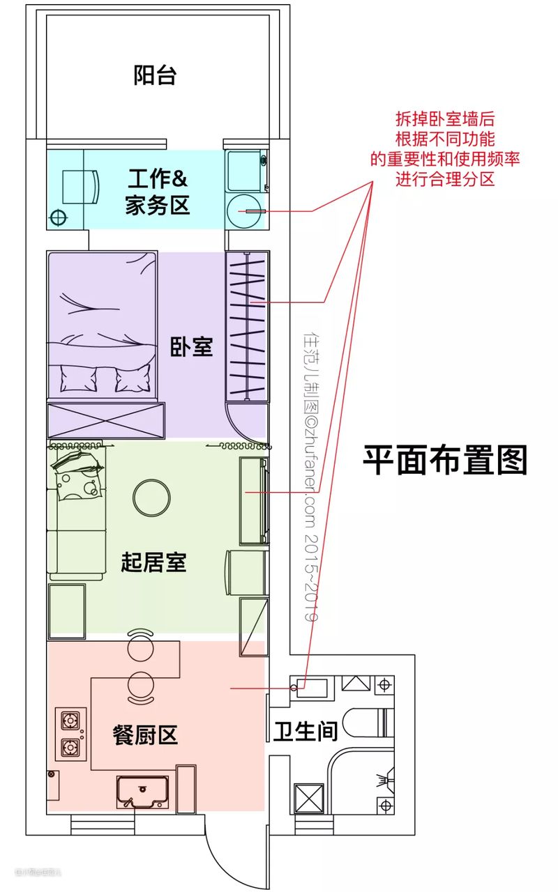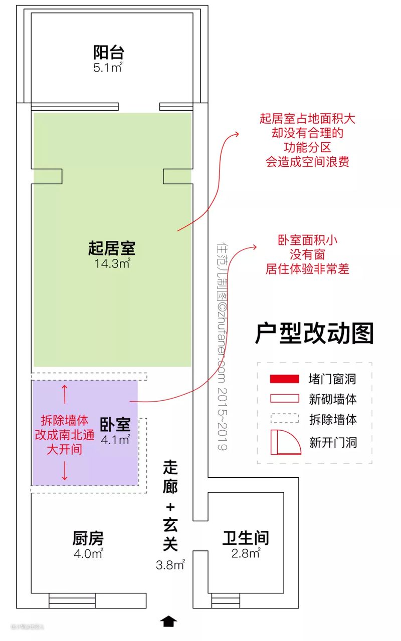 像这种长条型的户型就非常影响日常生活动线了,可以参考这个案例,打通后利用软隔断作合理功能分区,既没有空间浪费还保证了良好采光。