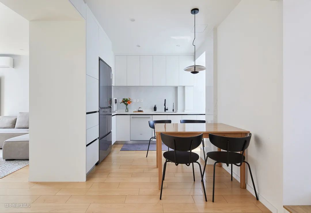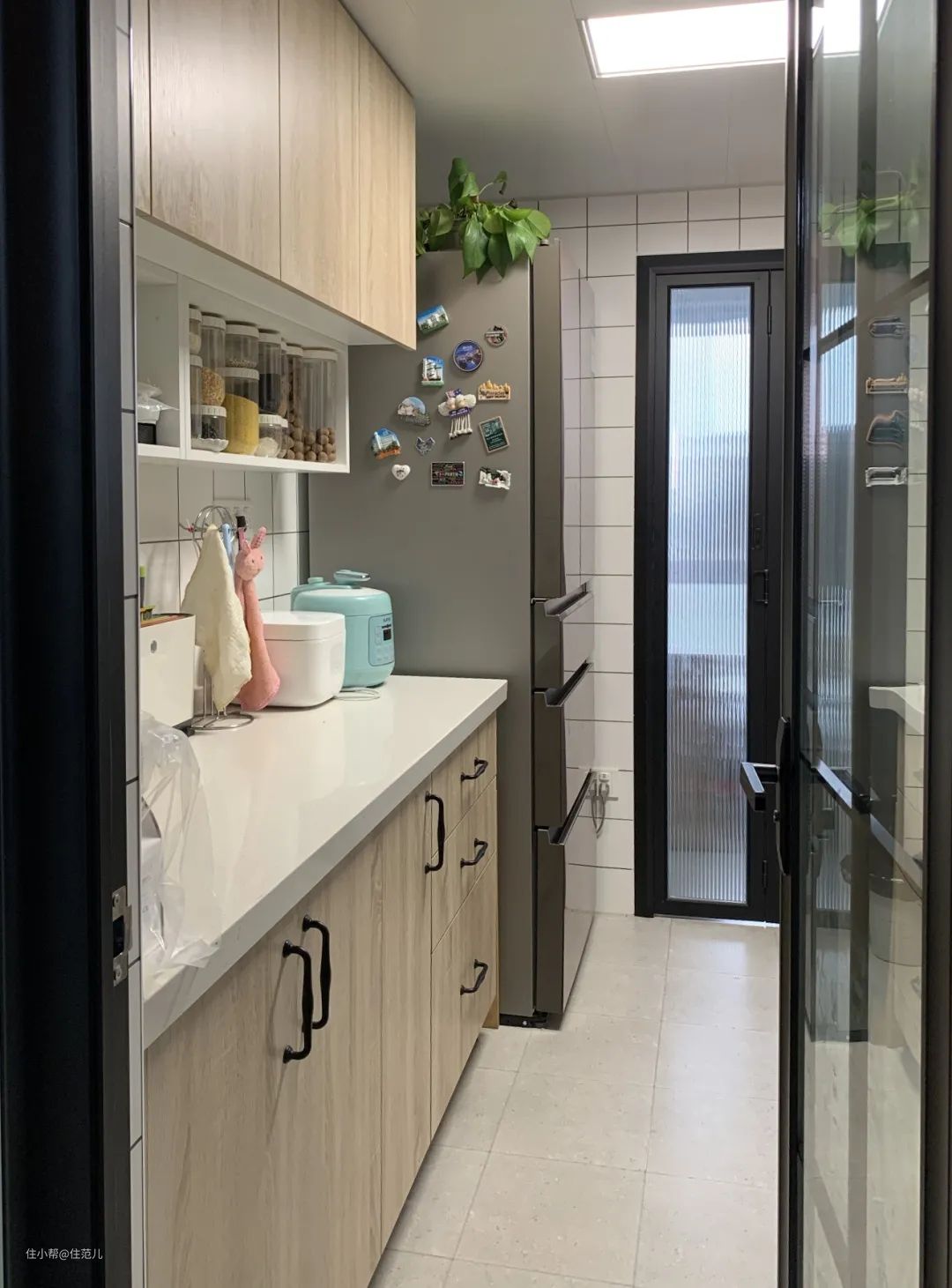 把厨房改成宽边开门,装上玻璃移门或折叠门,造价不会贵很多,能在视野和采光上保持畅通,必要时又能起到一定的阻隔作用。