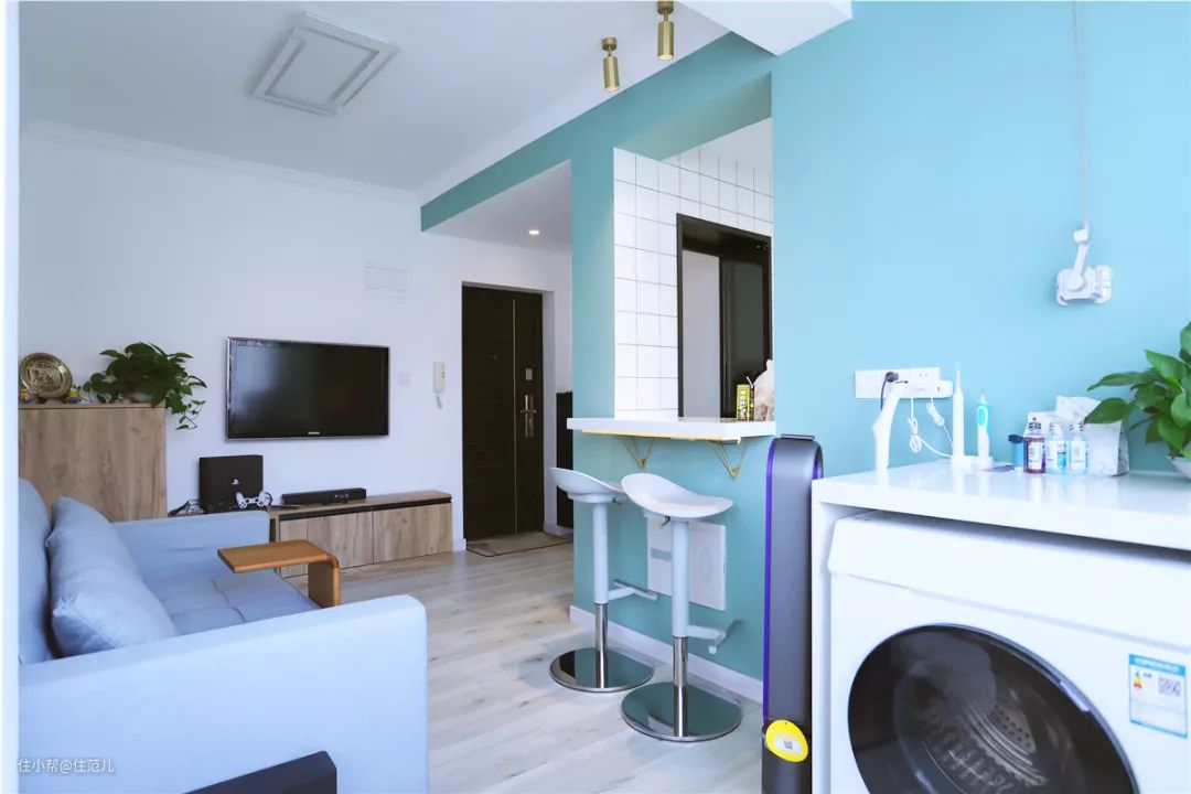 那就可以参考Julia家的做法,把下水管的柱子保留,和小吧台搭配在一起,作空间隔断。
