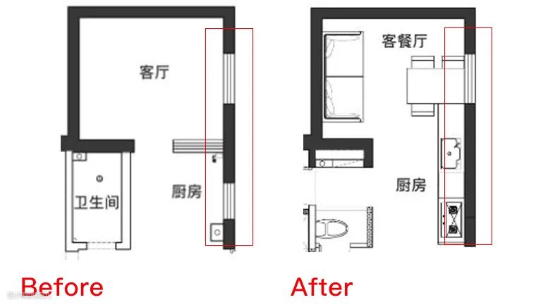 如果家里的墙非承重,能动,那就可以参考下面这两种方法,一是墙外推,二是改变厨房形状,从狭窄的一字型变方正的U型。