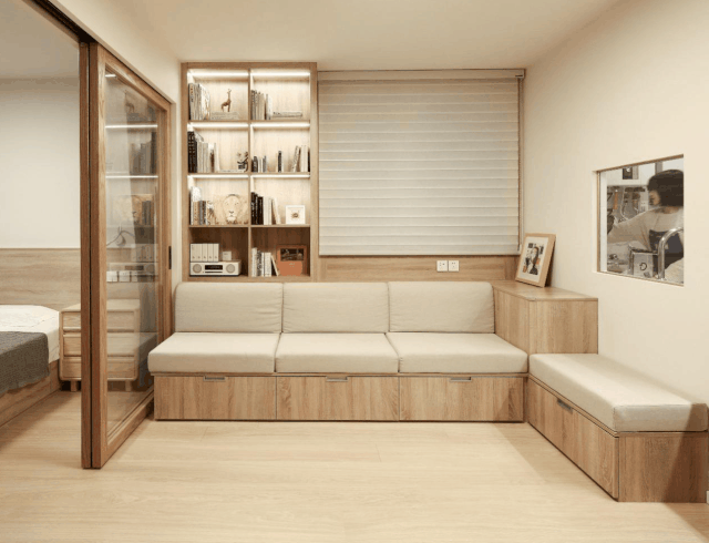 通顶收纳柜不用多说了,大家都知道。像下面这种可收纳的卡座,或者是去某宝搜搜收纳家具,只要选择得当,各种角落都能利用起来。