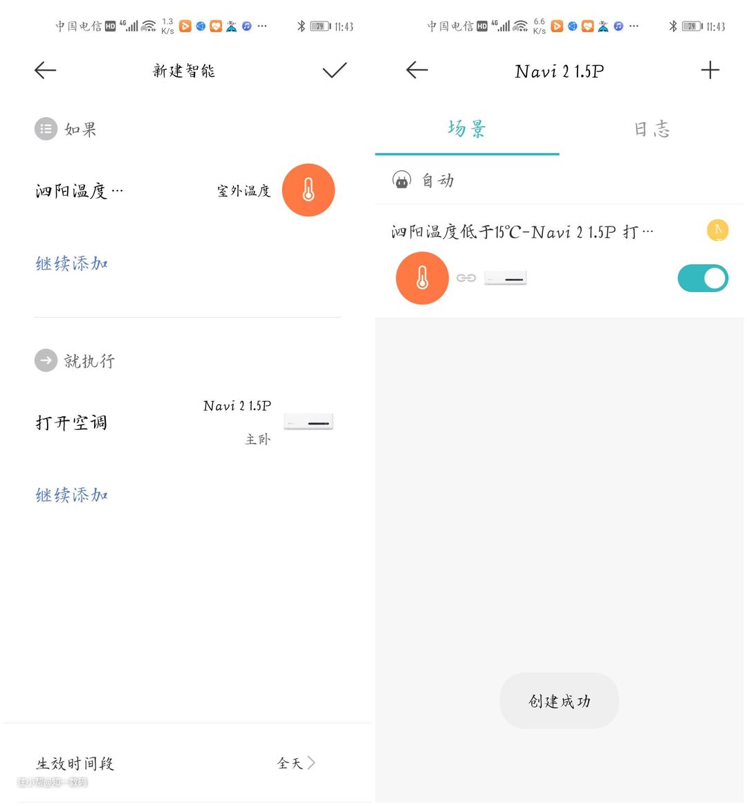 除了控制方便外,笔者特别喜欢自带智能场景的设计,这也是智能设备的一大特色,比如设定家所在地区温度低于15度时,就执行自动开启空调,还可设置开启模式等,这样在家使用的时候,特别是有孩子的家庭随时保持家居一个温度舒心的环境,这不是更舒服。