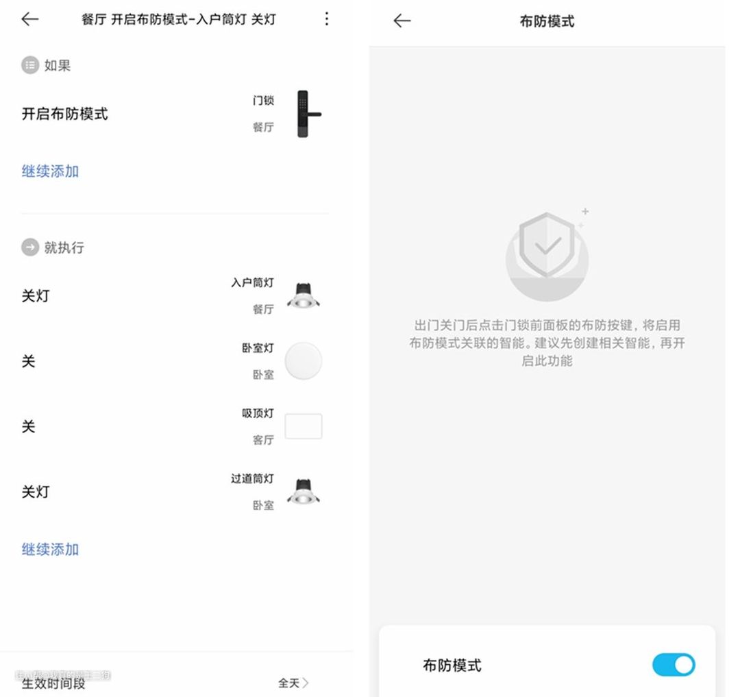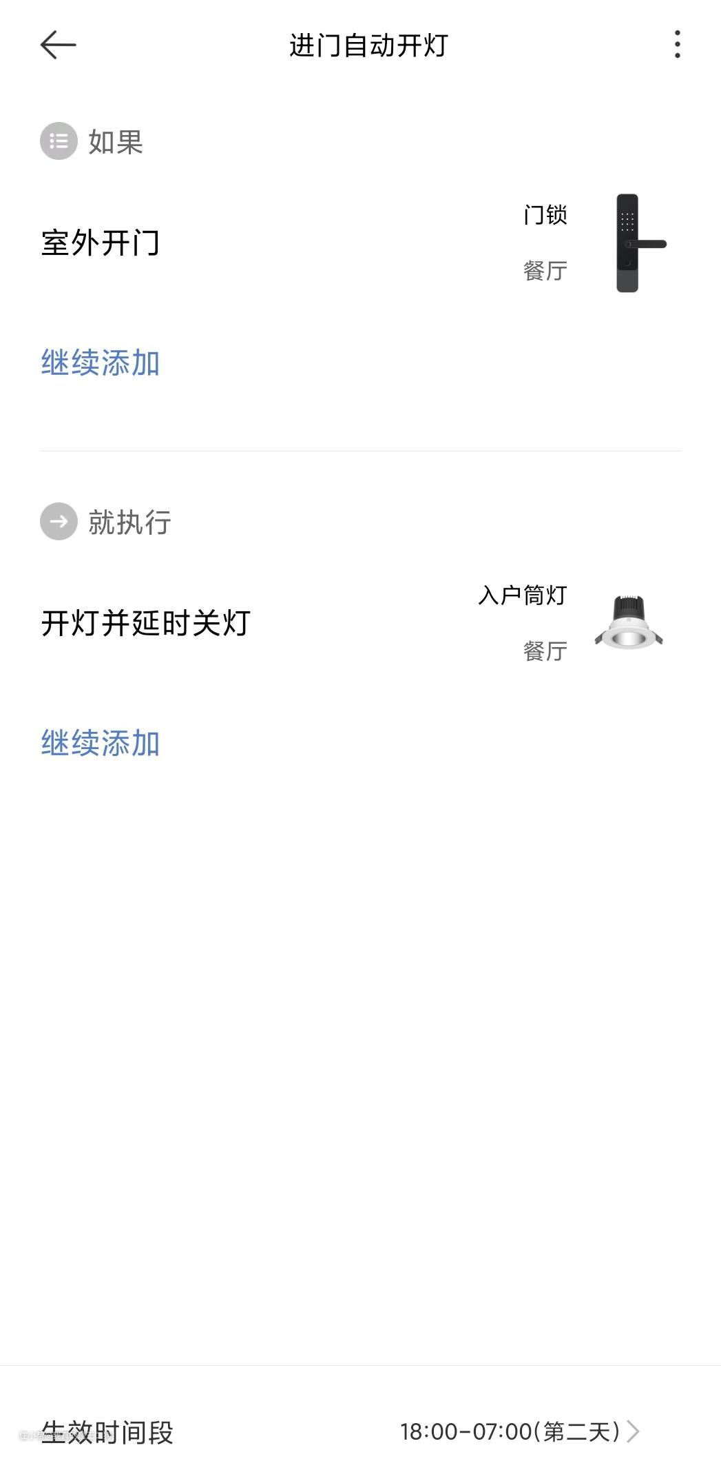 配合智能锁的联动玩法挺多,除了常见的离家打开布防模式、扫地机自动工作,进门自动开灯也算是很实用的一个设定。晚上回家通过设置开门后入户筒灯进行联动可以轻松搞定进门后自动亮灯,同时根据自己的实际需求可以选择亮灯的持续时间。考虑到过道只是晚间较暗,设定联动的时间可以选择在天黑后的时段执行。