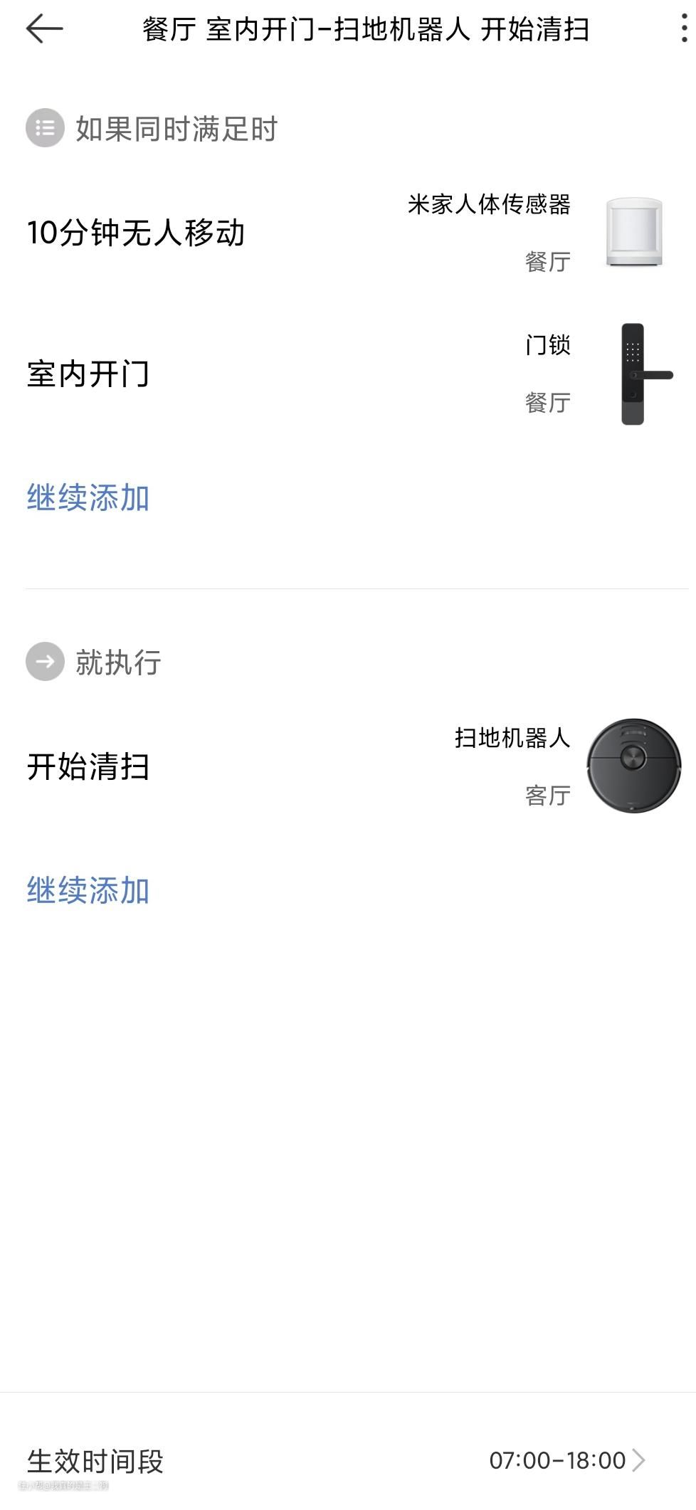 扫地机器人工作有一定噪音,选择离家的时候进行清洁是个不错的选择。配合智能门锁或者门窗传感器,检测到人离家后,可以让扫地机器人自动进行清扫工作。同时通过设定工作有效时段(7:00-18:00白天工作时间)和搭配人体传感器(10分钟无人移动,减少倒垃圾、临时开门这种无需真正执行扫地的需求)做一些更精确的限制匹配,做到任务设定更加准确。