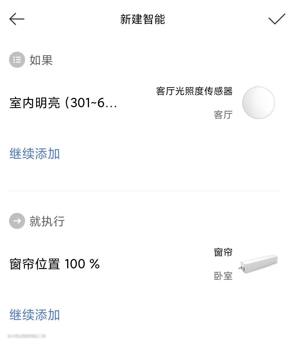 设置光线强度达到正常明亮范围,即300lux联动窗帘100%打开,实现窗帘在天亮后自动打开。类似还可以设置部分房间天黑执行窗帘自动关闭。