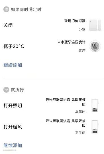 其实云米配合家中的智能设备,可以轻松实现自动打开浴霸。配合水浸传感器/门窗传感器/人体感应器/温湿度计的其中多个就可以实现。我的操作习惯是天气较冷(低于15摄氏度)的时候,洗澡的前会自动关闭通风窗。设定逻辑就很简单啦,人体传感器监测到室内有人,同时通风窗关闭,同时温度湿度传感器检测到实际问题低于20摄氏度,就可以联动云米的浴霸自动打开风暖和灯光,是不是很方便。