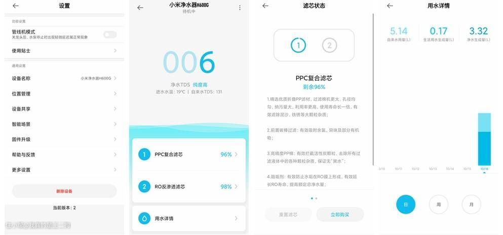 作为一款智能化的净水器产品,H600G支持接入米家生态链。可通过米家APP远程实时了解各类信息和进行设定,工作状态和滤芯使用情况相比不少厂家的产品了解更加直观。