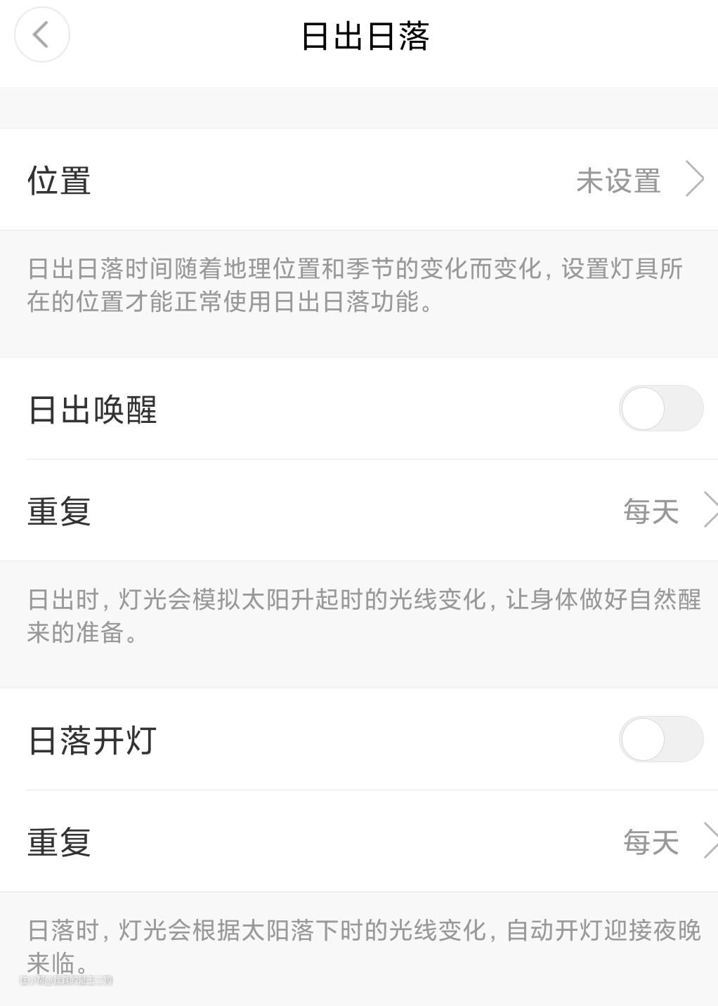 日出日落功能就是一个很有意思的玩法,通过设定灯光可以伴随日出和日落进行相应的光线调整,简单设置灯具的位置和重复条件,就可以智能化进行日出日落的光线自动控制咯。