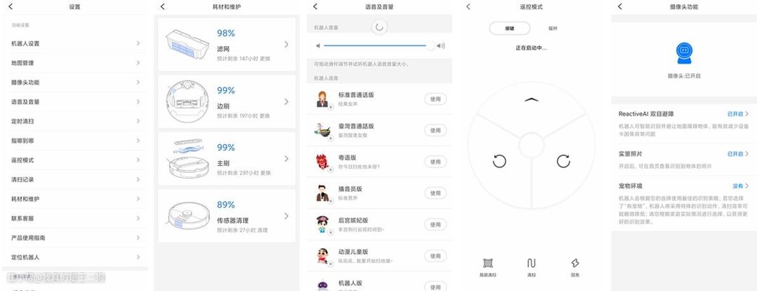 APP中的设置可以针对自己的需求了解更多的信息和进行一些深度化的需求定制,比如了解滤芯和耗材使用情况、语音相关设置、遥控模式、摄像头功能设定等等。