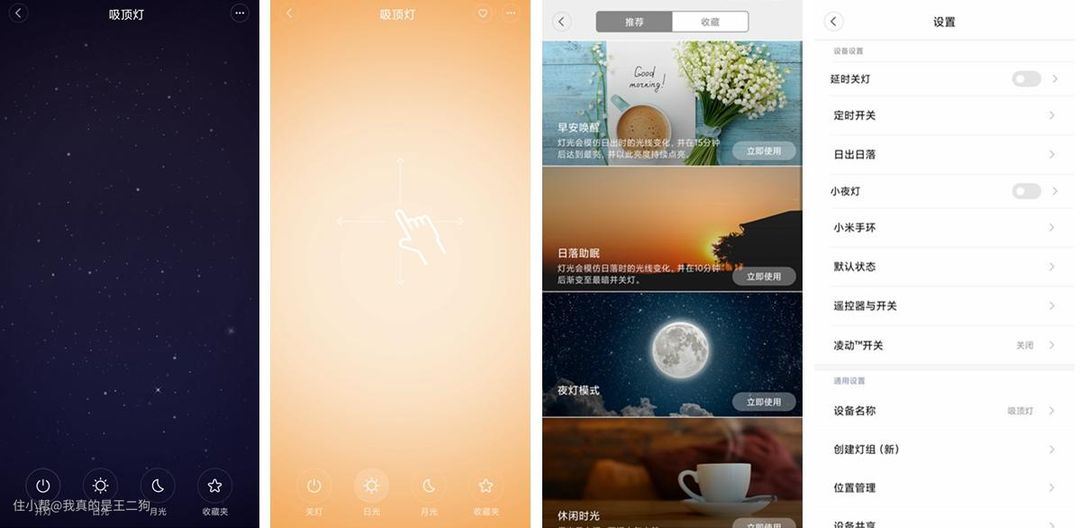 纤御系列的吸顶灯大小规格不同,但是不管是卧室灯还是客厅的主灯智能功能都基本一致。卧室灯没有标配遥控器,不过也可以配合遥控器和调光开关使用。APP的设定和操作整个纤玉的产品保持一致,除了常规智能联动、色温、色域调整,还有不少特别的功能可以在设置中进行详细设定。