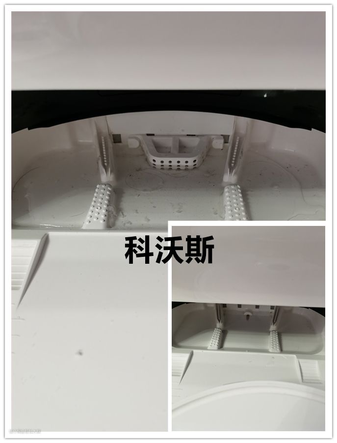 科沃斯机器有加压功能,而且自有水箱,为的是拖布能保持湿润,不会越擦越干。这块看似细节掌握的很好,实际上擦出来的是这样的。地面上会留有小水珠。