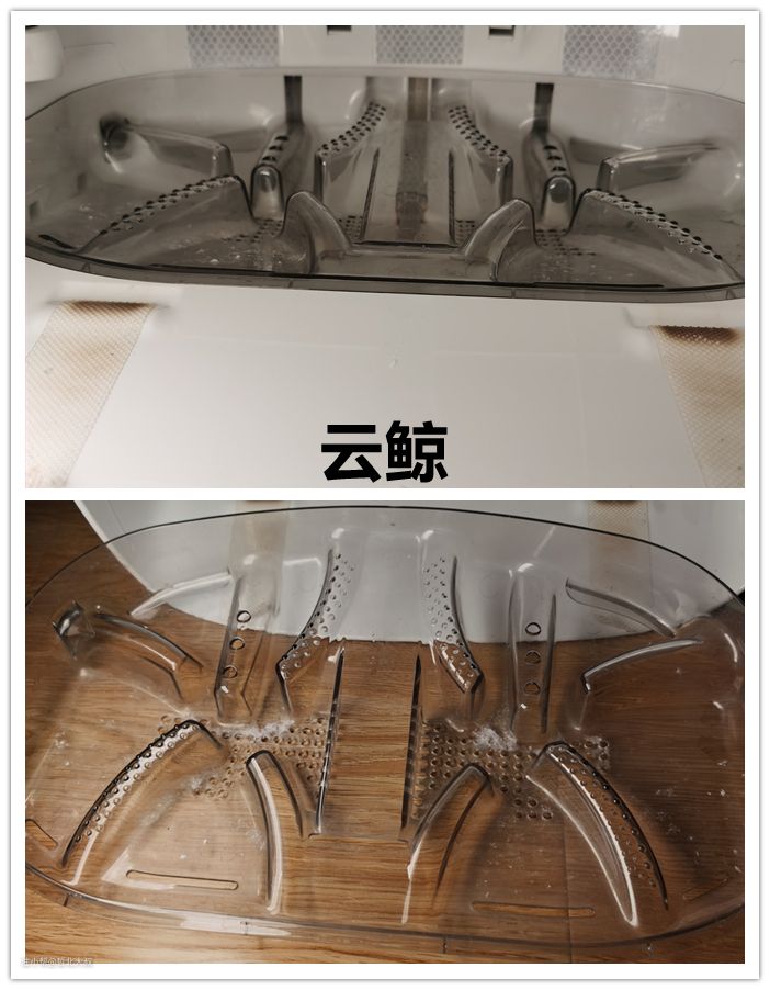 我家两款机器在完成工作后都要进行清洗。云鲸的底座是需要抽出来清洁的,之前有朋友不知道这块的。而科沃斯就不用,可以通过按键出清水,擦拭干净后,再按按键吸走污水。