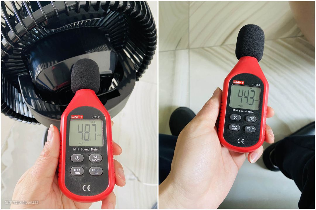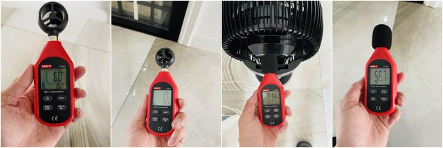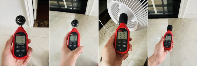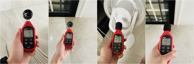 首先我们把三款产品都调至最大档,在离网罩15cm的距离先测试一次风速。然后我们在距离空气循环扇4.5米的距离在测试一次风速,接着我们测试一下机器在这个工况下的噪音。结果如下: