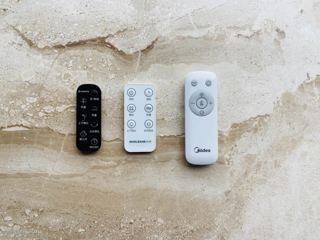 遥控器,从左往右分别为艾美特、舒乐氏、美的。
