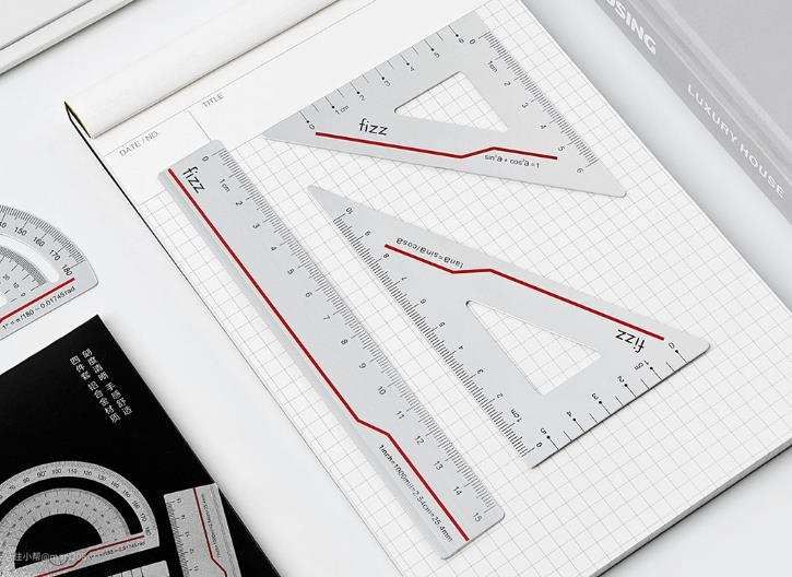 该铝合金材质的套尺含有30cm直尺+角尺量角器套尺,轻盈耐磨,刻度清晰,尺子表面打磨细致,磨砂手感出众。 铝合金直尺背面支脚设计,按下稍厚一侧尺子就会自动翘起,轻松解决尺子紧贴在桌面不易拿起的烦恼。在边角处也做了圆角处理,安全贴心。