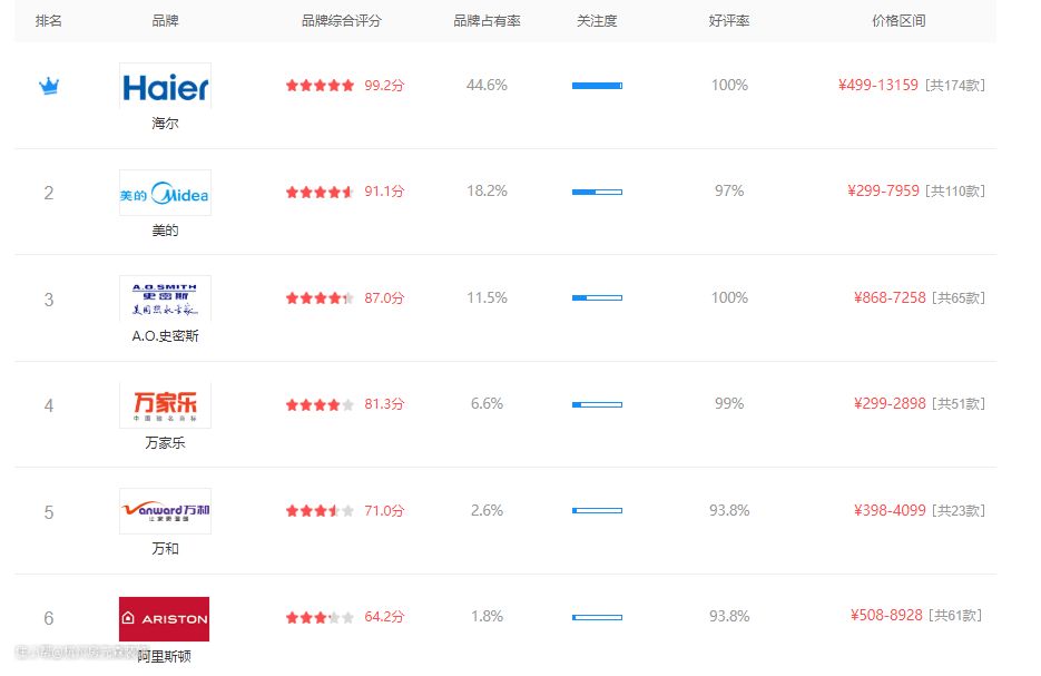 目前市面上比较好的电热水器品牌,其实不外乎这么几个:海尔、史密斯、美的、阿里斯顿、万和、万家乐(不同网站的统计会有不同,但都大同小异)。电热水器的品牌,很大程度决定了电热水器的质量,一分钱一分货,大品牌的电热水器除了价格贵一点外,在品控上自然也有保障,选择这些品牌准没错。