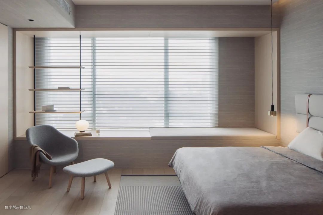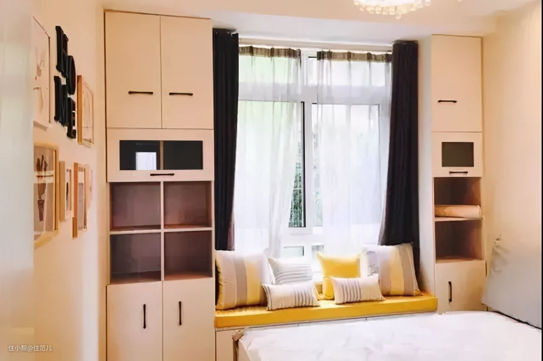 如果卧室面积真的小到床只能挨着飘窗摆,不妨转变思路,把飘窗的空间延伸出来改造成榻榻米,避免床比飘窗高的情况。