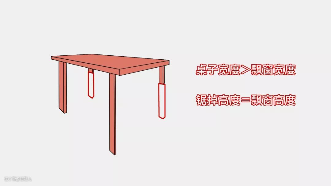 改造时需要提前测量好窗台高度和宽度,把宽度大于飘窗的旧桌子锯掉两条腿,并搭在飘窗上,就能有放腿的空间。