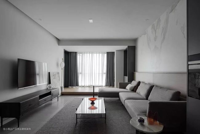 客厅开间不够时,且电视背景墙是非承重墙时,我们可以把电视嵌入墙体,整体效果简洁大方。在墙面粉刷色彩不同的情况下,可以适用多种风格。