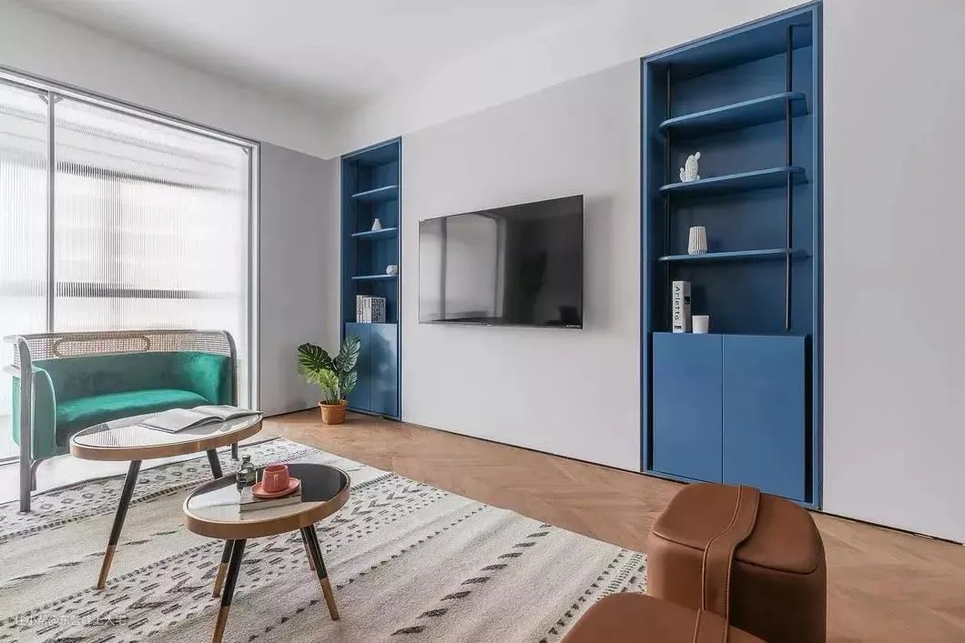 内嵌于墙面的电视柜最节省空间,根据墙面特点和电视的大小,现场定制收纳柜,容量大又整齐,可以满足大部分的公共物品收纳和图书、藏品的收纳。