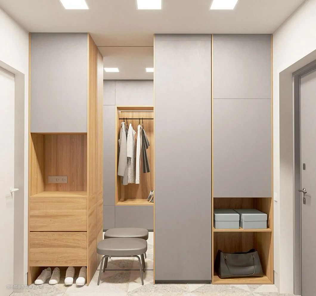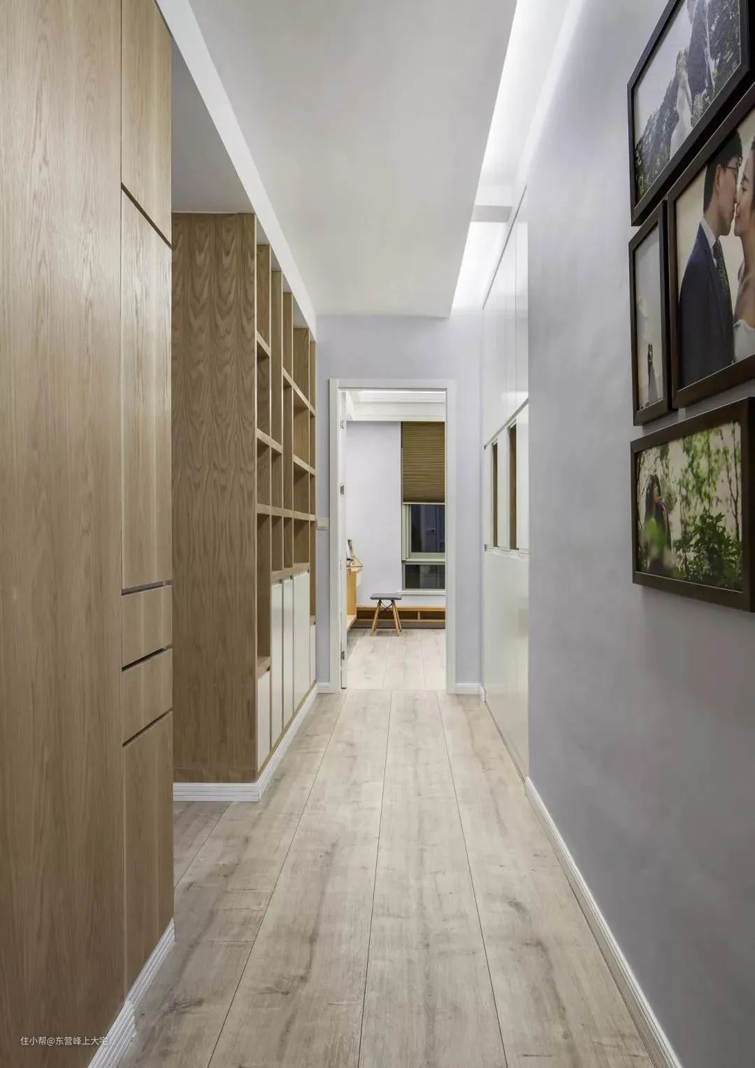 通常来讲,走廊尽头一般都有墙体,虽进深不大,但只要设计巧妙,利用这小小天地把柜体嵌入进去,做成齐门槛的嵌入式收纳柜,轻松得到≥2m²的收纳空间。