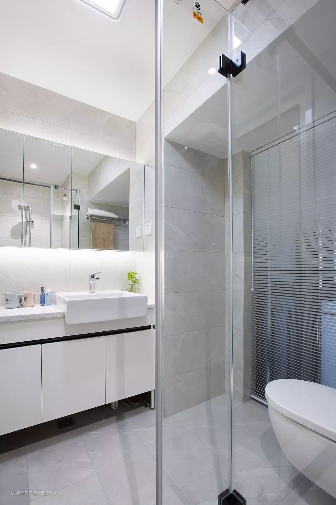 卫生间内做了干湿分离的设计,洗手台的尺寸是比较大的,除了台盆之外,也有足够摆放洗漱用品的地方,而且还有镜柜提升收纳能力。