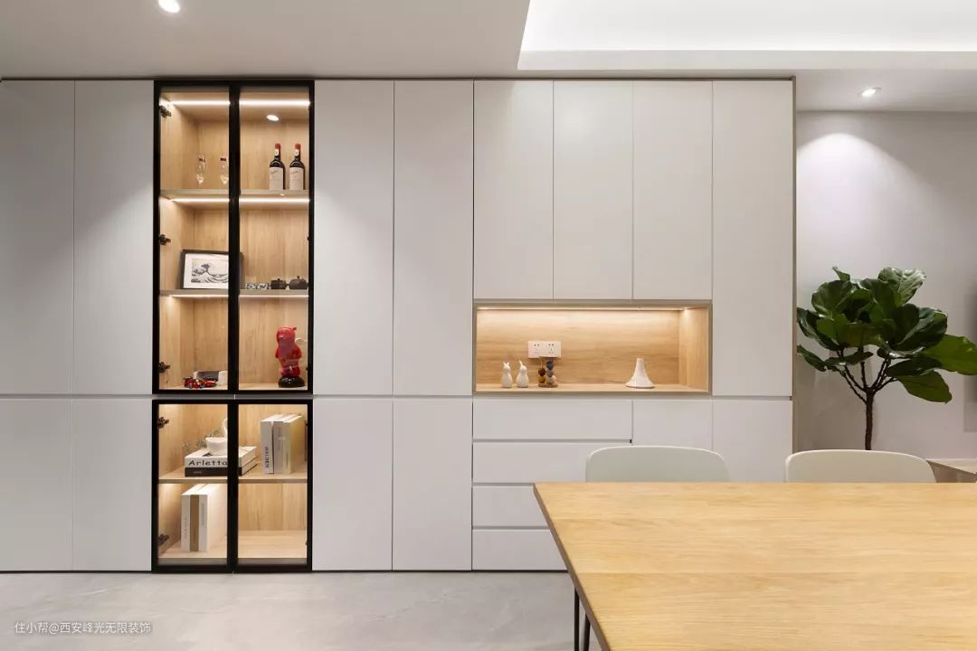 餐厅侧方的餐边柜,非常喜欢的设计,玻璃柜门加上留空的格子内都加入了藏光,搭配白色与木色结合的设计,让人感觉时尚又舒适。