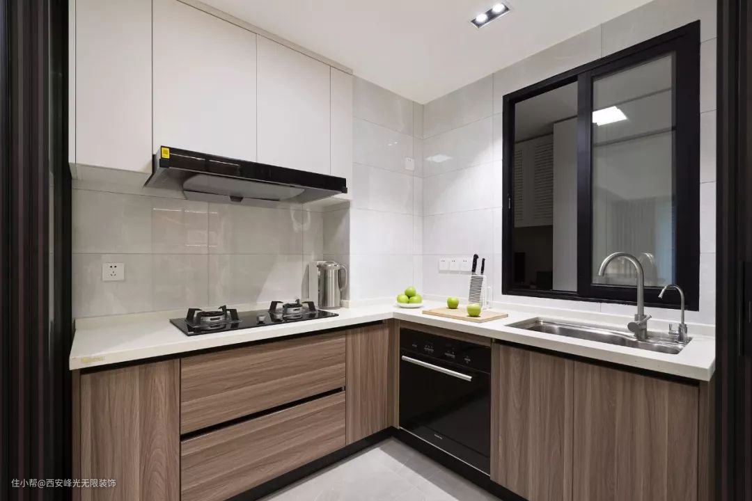 厨房的玻璃门是可以收起来的推拉门,做饭的时候把门给拉上,就不用担心油烟的问题了。L形的橱柜布局方案,让厨房显得紧凑又实用。