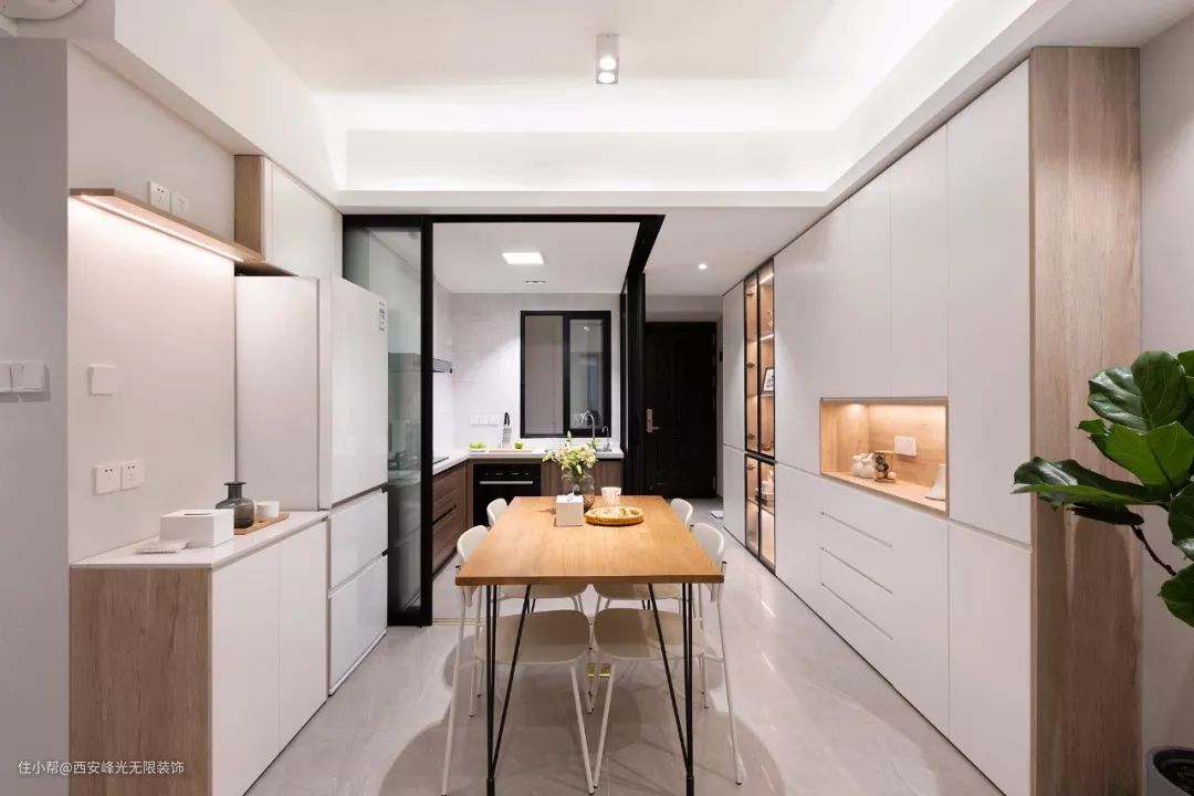 走过玄关就到了餐厨合一的空间,餐厅侧方的餐边柜一直延伸到了玄关处,另一侧也做了矮柜的设计,冰箱放在角落里,整个空间看起来宽敞又明亮。