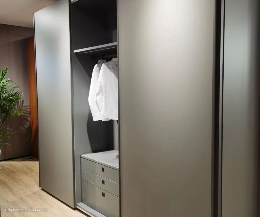 推拉门的衣柜,因为多了导轨的厚度,所以整体柜体的厚度会更深,不过推拉门开启柜门不受柜体以外的空间影响,对于比较狭小的卧室来说会更加实用。