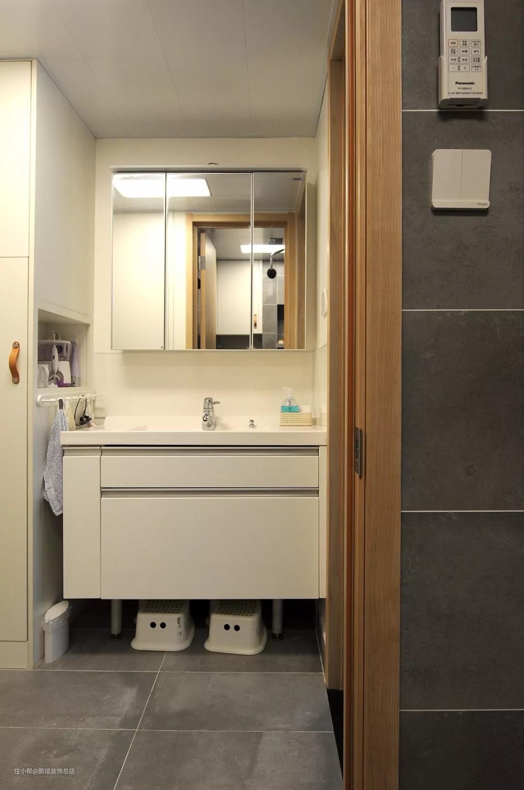 洗手台外移,既很好地进行了干湿分离,也解决了浴室空间紧凑的问题,除了洗手柜可以进行收纳,镜柜也是一个巧妙的收纳设计,就连下方的悬空部位也能摆放两孩子的小凳子,睡前洗脚也很方便。