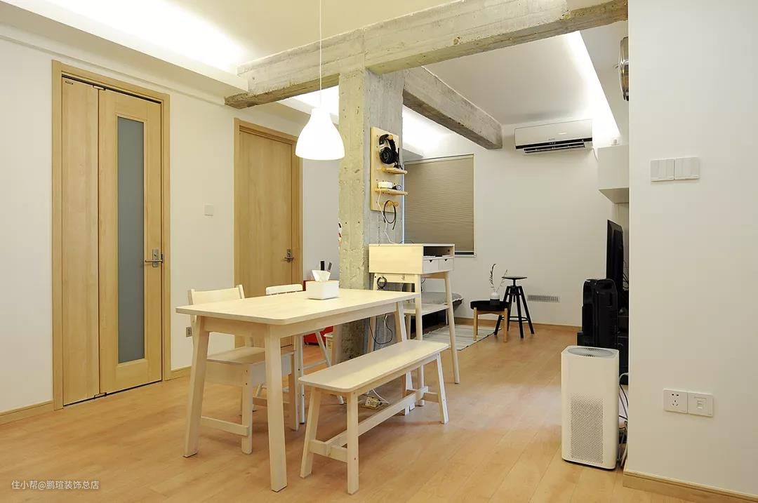 餐厅家具选择原木材质,与周围空间自成一体,非常和谐自然。一桌+两椅+一长凳的组合突破了传统沉闷的搭配,长凳子高矮正好合适两孩子用餐。