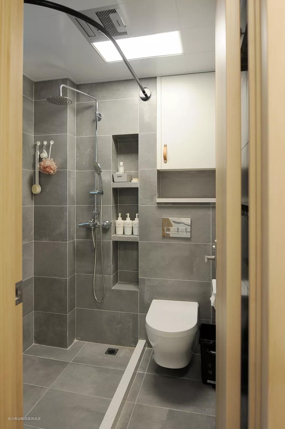 浴室用灰色亚光瓷砖通铺,耐脏又防滑,安全性与实用性都极佳。
