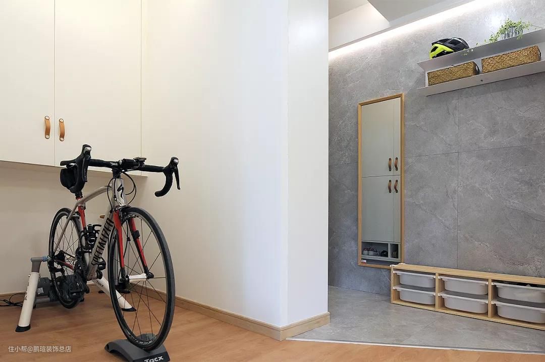 玄关柜不靠墙,既缓和了入室见厅的冲击,又能多出一个大小适中的杂物间。墙面打造的悬空壁柜用来存放行李箱、雨伞,空出的位置摆放先生的充电自行车,家里杂物就像变少了一样。