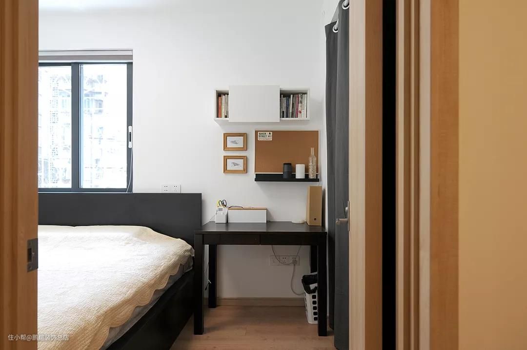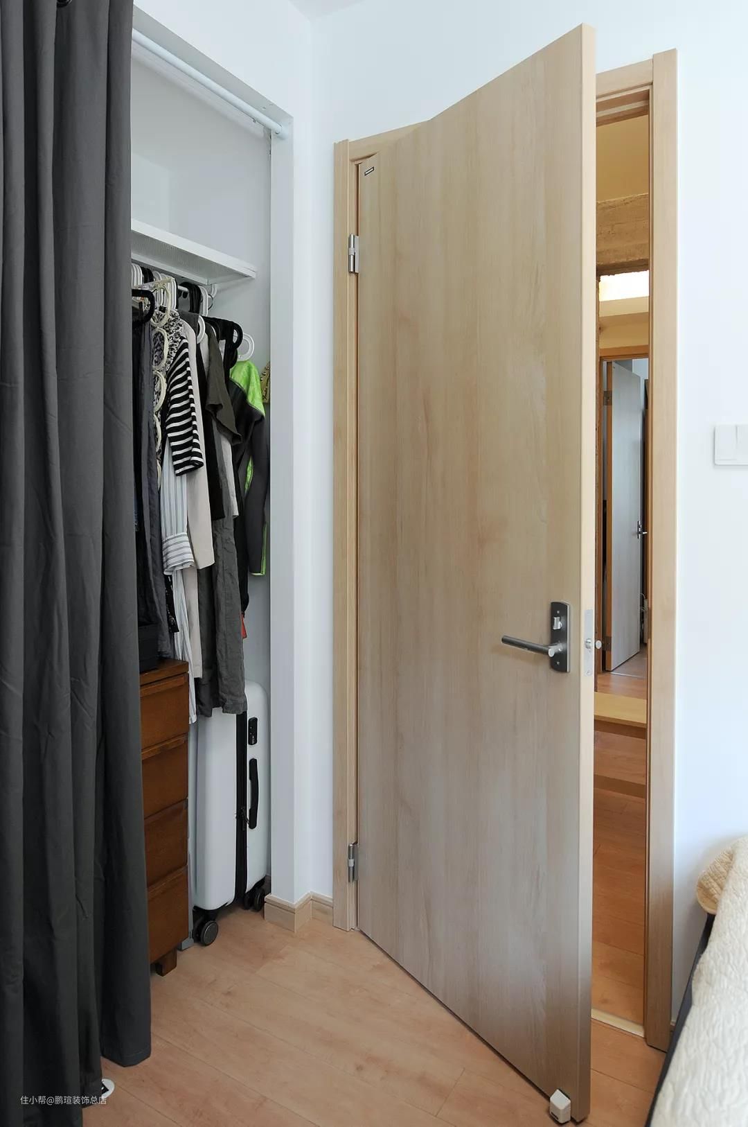 卧室空间有限,但衣物收纳需求是必要的,所以设计师将靠墙的一侧打造了内嵌的空间,顶部安装挂钩可以陈列衣物,下方放置斗柜可以存放袜子以及各类小物件,效果也很好哦!