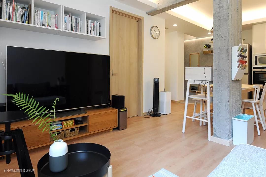 客厅位于餐厅一旁,因为空间有限,但是我们也更多地喜欢居家看书,所以电视背景墙上边安装了悬空书架,每个格子放上我们一家四口最近各自必读的书籍,回到家除了吃饭睡觉就是大型的“读书现场”,氛围感挺不错。