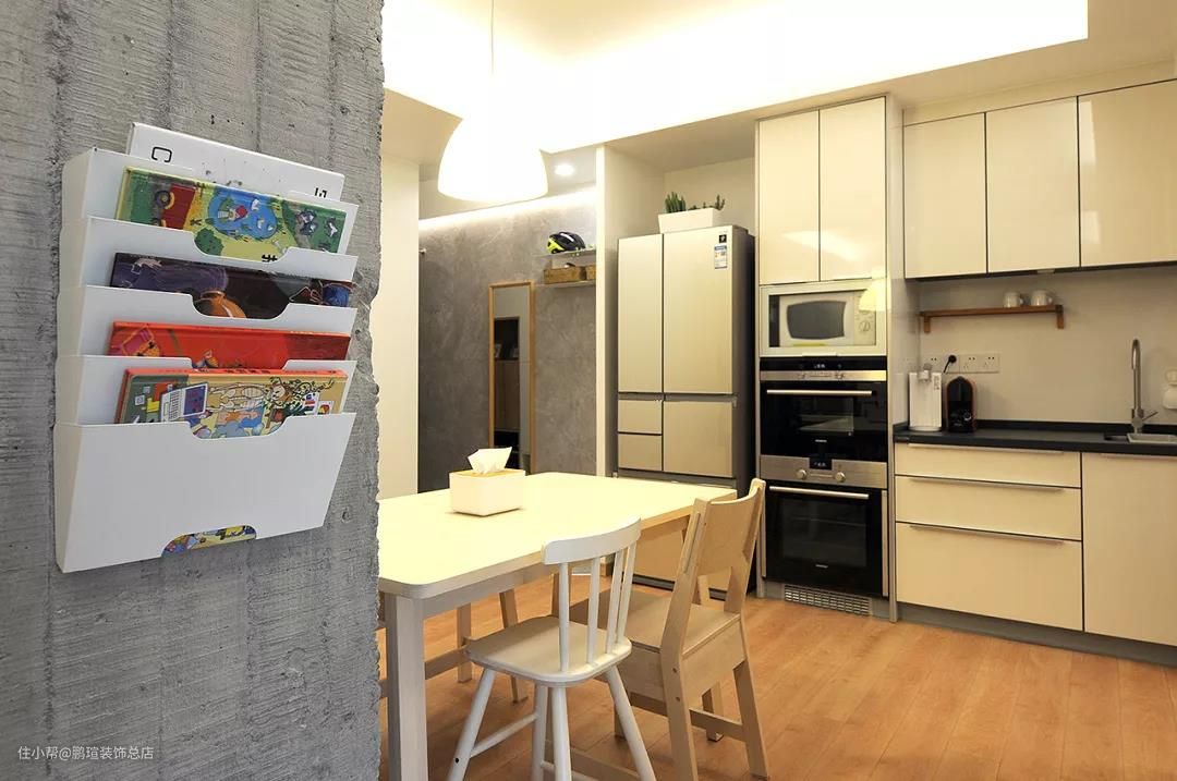 工业风满满的水泥梁柱安上了挂壁式收纳架,平日里放上孩子喜欢的儿童读物,拿取很方便,用餐结束后在餐厅就能进行有趣的亲子互动。