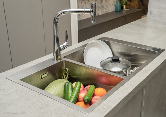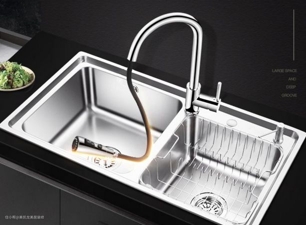 一大一小的双槽,适合中国家庭的烹饪和洗涤习惯,大的槽,尺寸最好超过45mm,保证能够放进一个炒锅,这样大槽方便洗锅洗碗,小槽可以洗蔬菜水果。