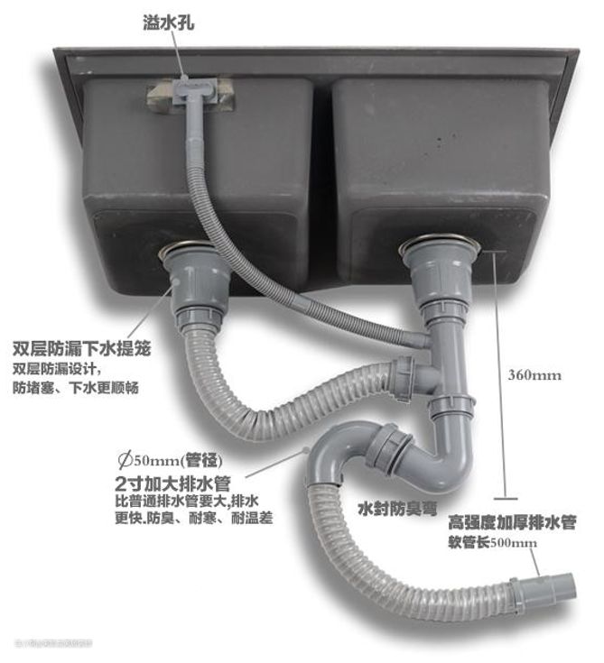 水槽的排水管要选直径大(最好能达到50mm),不容易堵,水管材质要耐高温、抗冲击,排水管连接处的管阀、胶圈密封性和抗老化同样重要。