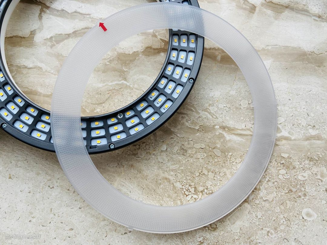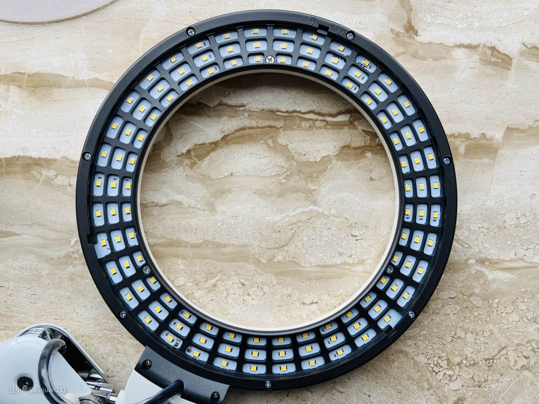 拆下灯罩可以看到108颗矩形排列的LED灯珠,据介绍光源直径达到25CM,素质不错。开灯后实际可照明面积比较大,效果较为不错。光线分布比较均匀。