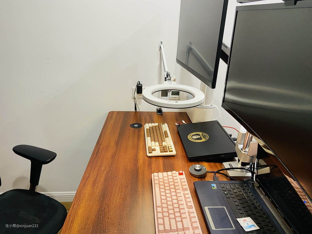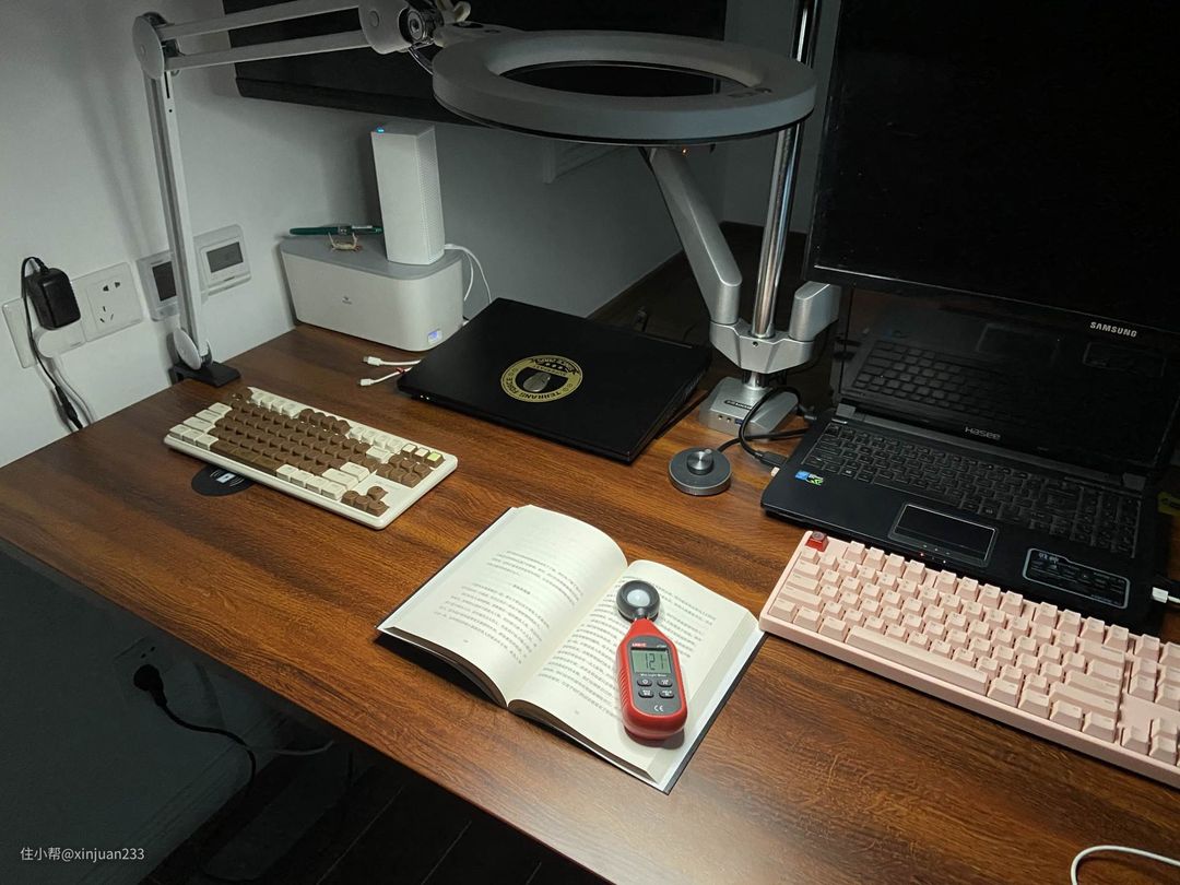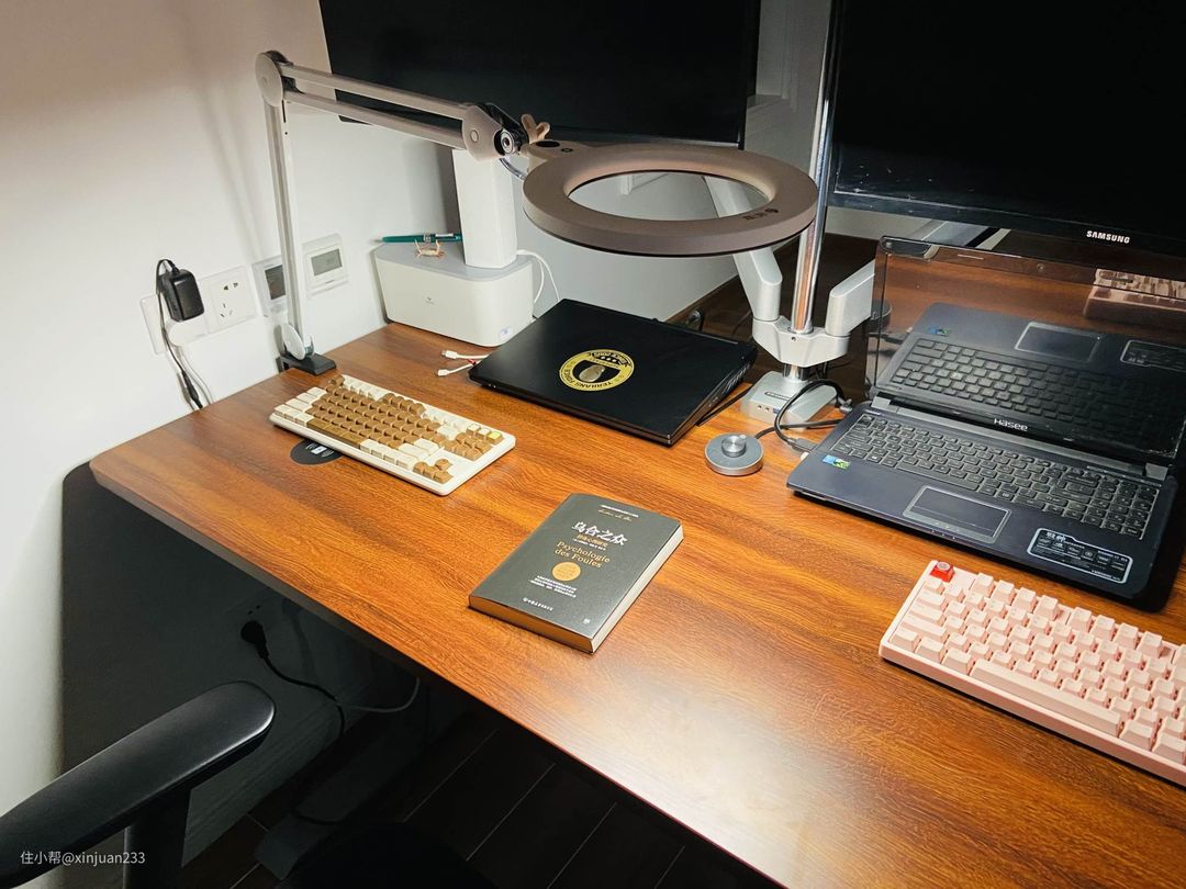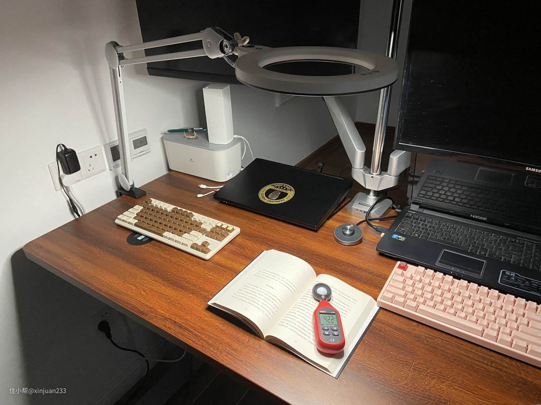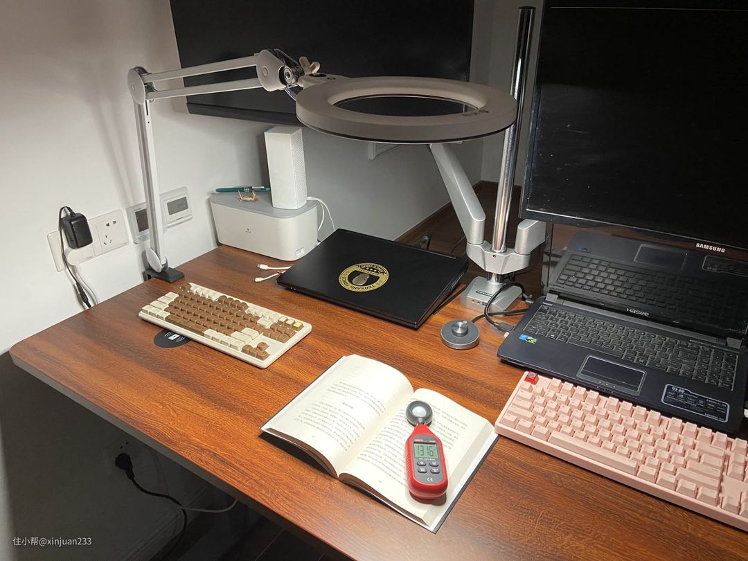 其次,我是双笔记本用户,出于成本的考虑,我没有购置新主机而是选择了继续使用我14年购买的老笔记本电脑。笔记本虽然相对小巧,但是却无法像主机一样隐藏在书桌下面,必须要占用一部分桌面空间。再加上一些必要的线材,就会使得原本不大的桌面更加拥挤,空间上就很局促。而普通的台灯往往有一个面积较大的底座,我一直没有想好如何处理这个底座的问题。