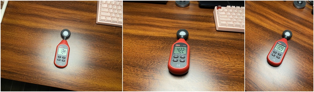 我们来看一下我日常使用中的光源亮度,50CM的高度,一档、二档、三档的亮度分别是134LUX、422LUX和1309LUX,满足日常的使用需求是没什么问题的。