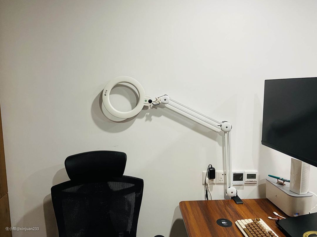 可以看到,灯具几乎是完全紧贴着墙壁,完全不会影响到桌面上的任何别的产品,更不会遮挡显示器,如果不是特意关注它,几乎不会意识到它的存在。同时较高的灯头位置也使得我们很少有机会误触到,保护了灯具本身。