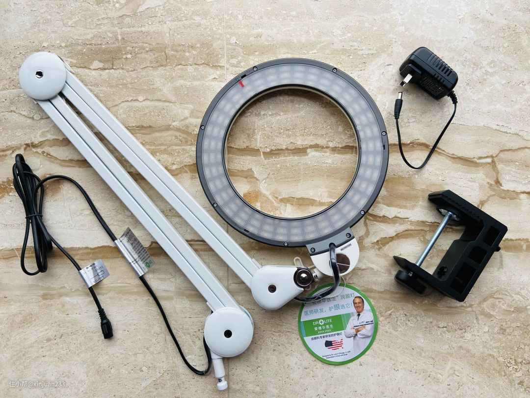 取出整套灯具,可以看到零部件并不多。一共是一套环形灯、一个灯臂,一个电源适配器以及一个桌夹,组装起来很方便。