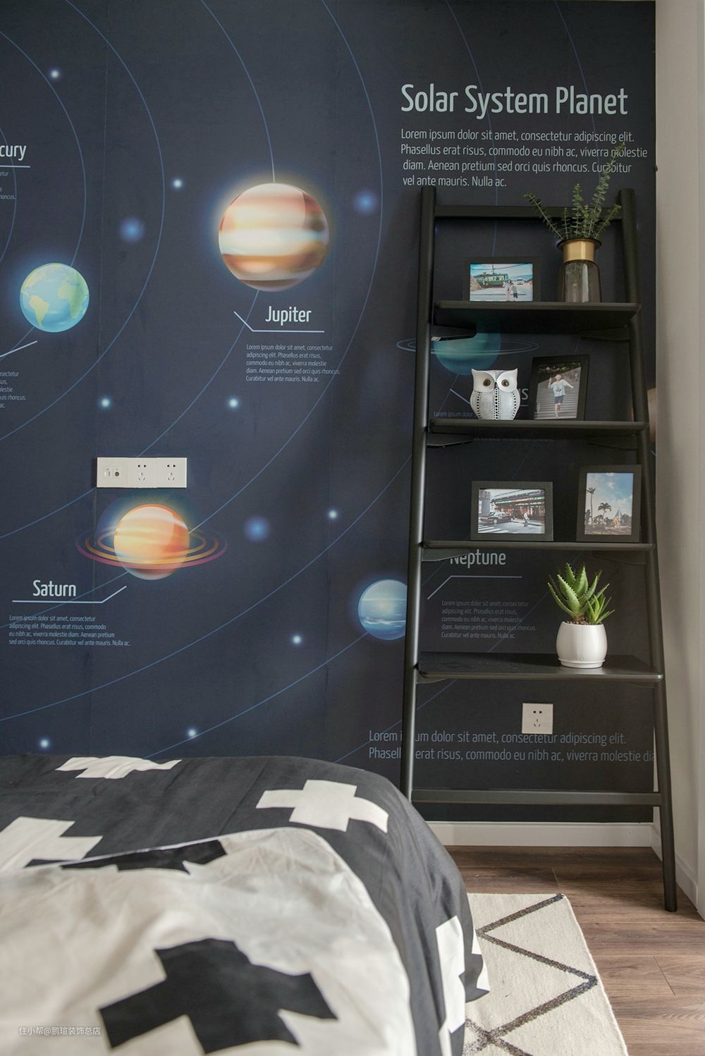 床尾的墙面绘制了天文图案,充满了神秘的科技感。一旁的多层置物架摆放上装饰画、绿植和猫头鹰小摆件,尽显儿童的天真活泼。