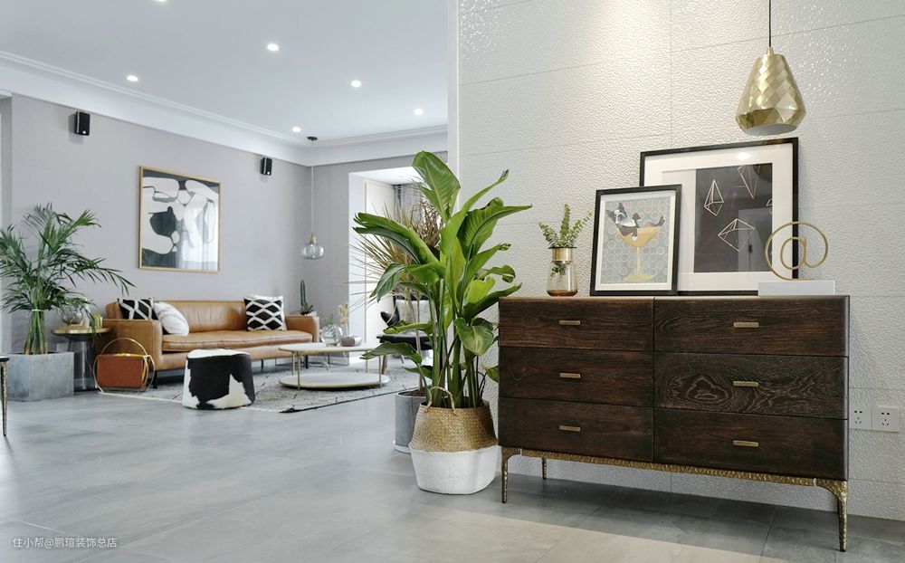 门厅处打造了简易的木质玄关柜,下层的多格抽屉可以容纳进出门的储物需求,上层可以随手放上钥匙、装饰画和小绿植,既美观又实用。