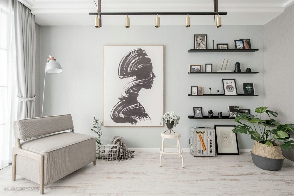 墙面打造了多层收纳台,随手放上日常的装饰物和画框,便能将空间的视觉效果更加丰富起来。一旁的巨幅抽象画,也能将空间的艺术气息再次拔高。